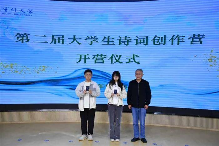 老山含黛,诗意流淌,2025年10月25日下午,我校第二届大学生诗词创作营开营仪式在浦口校区大学生活动中心一楼心学堂隆重举行。本届大学生诗词创作营由江苏省诗词协会与我校联合主办,副会长袁功民、子川、杨学军,副秘书长王晓然,中华诗词学会十大导师子川班班长尤树林,常务理事赵怀民等专家领导莅临指导。南京审计大学党委副书记、校长陆华良,校党委常委、副校长周方舒,校团委副书记胡业宇以及国际学院领导班子代表出席仪式。仪式由国际学院副院长张文秀主持。