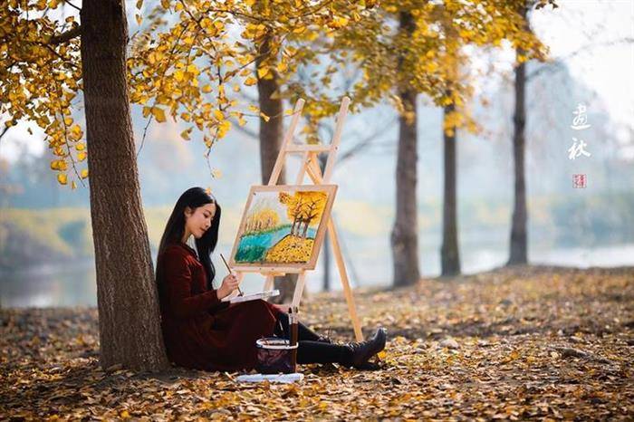 画秋手挥秃笔静思谋,七彩斑斓润色稠。
