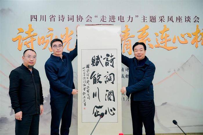 随后,诗词专家与电力工作者围绕“诗词记录电力故事”“企业文化的诗词表达”畅所欲言,深化了文化与行业融合的思考。座谈尾声,四川省诗词协会向国网成都供电公司赠送了诗词书法家邹文然精心创作的“诗词润心、赋能川企”的书法作品。