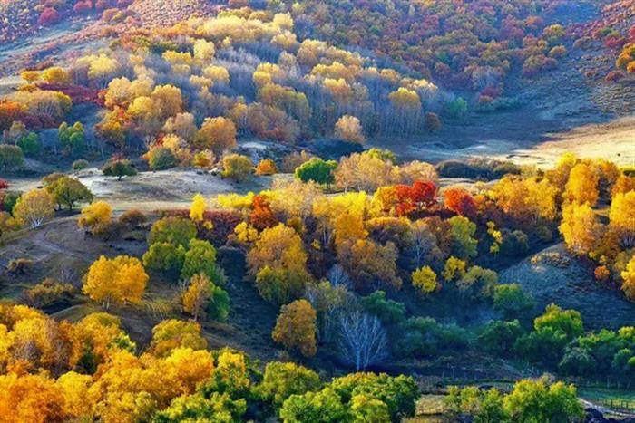 谁将彩墨洒千岭,一夜狂潮染尽黄。