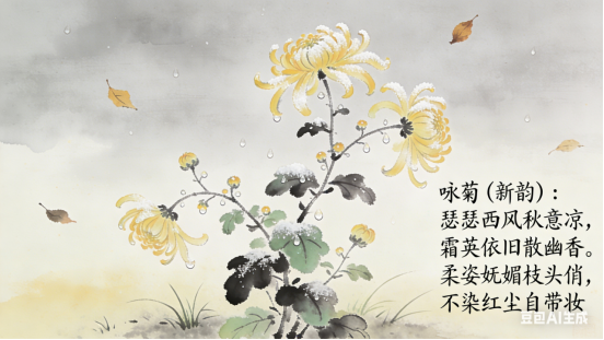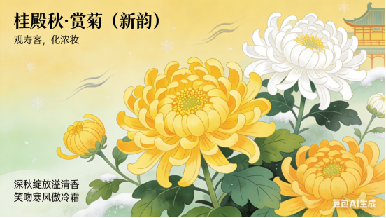观寿客,化浓妆,深秋绽放溢清香。仙姿玉骨娇颜俏,笑吻寒风傲冷霜。
