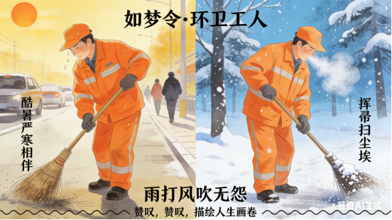 酷暑严寒相伴,身影长街再现。挥帚扫尘埃,雨打风吹无怨。赞叹,赞叹,描绘人生画卷。
