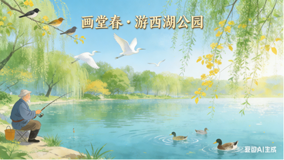 湖面微波荡漾,野鸭嬉戏声声。引来垂钓捕鱼翁,抒展心情。