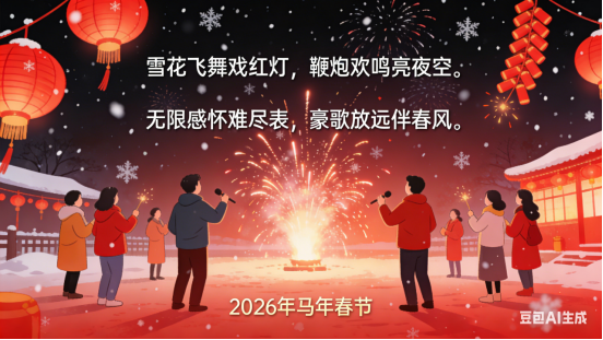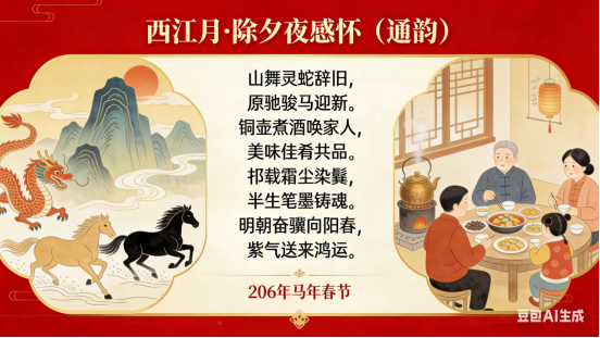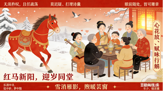 辞旧岁,贺新春,桃符韵里送佳音。举杯畅饮同欢庆,再展宏图景更新。