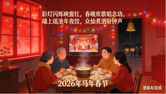 粘福字,挂纱笼,佳肴满桌喜融融。银屏春晚东风舞,骏马开篇夜半钟。