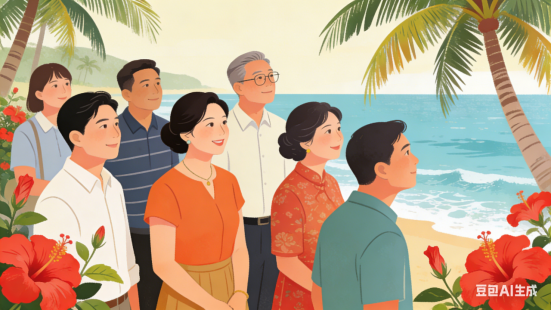 欢聚崖州朱槿红,同窗情暖沐椰风。久别长叙伴潮声。