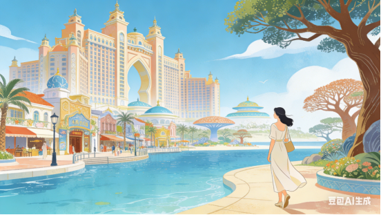三岛如花映碧空,人工巧筑胜天成。巍峨欧堡似仙宫。