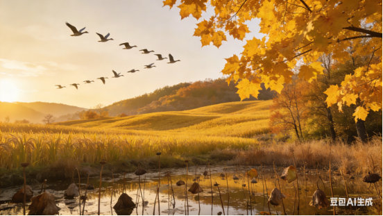 霜染梧桐泛叶黄,满山稻谷换金装。雁南远去叫声杨。