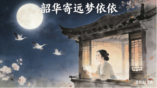 塞北城郭雪舞风,江南水岸映花红。别情共赏月朦胧。