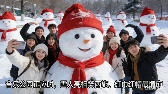 音乐公园正应时,雪人亮相笑西施。红巾红帽最情痴。