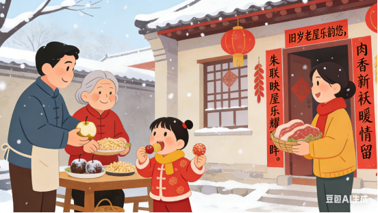 旧岁老屋乐韵悠,朱联映雪耀明眸。肉香新袄暖情留。