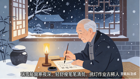 瑞雪敲窗寒夜深,轻舒瘦笔笔清贫。挑灯作业古稀人。
