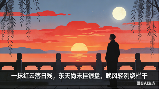 一抹红云落日残,东天尚未挂银盘。晚风轻冽绕栏干。
