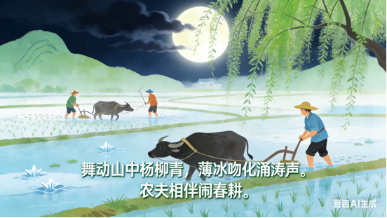 舞动山中杨柳青,薄冰吻化涌涛声。农夫相伴闹春耕。
