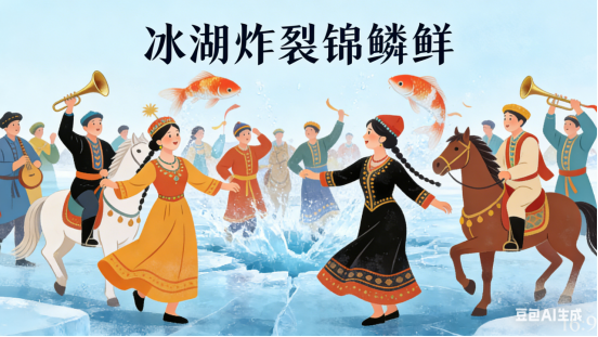 巨网翻腾银光现,冰湖炸裂锦鳞鲜。头鱼披彩更值钱!