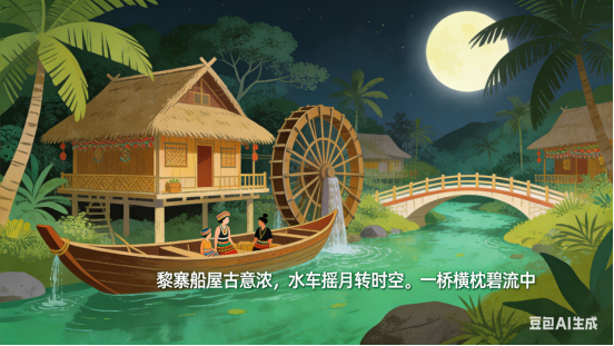 黎寨船屋古意浓,水车摇月转时空。一桥横枕碧流中。