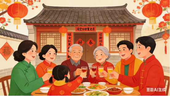 绿女红男聚老房,同堂四世共飞觞,迎新辞旧乐无疆。