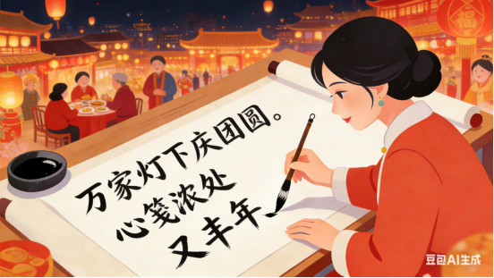 千户门前听笑语,万家灯下庆团圆。心笺浓处又丰年。