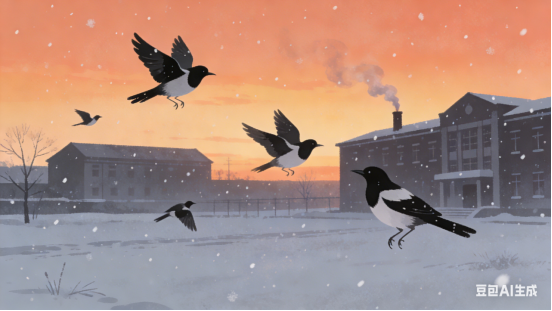 几点黑白鸦鹊逐,炊烟寥落雪花疏。怆然母校那空芜。
