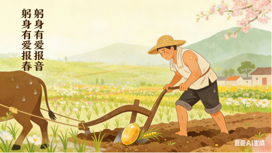 俯首无言披细雨,躬身有爱报春音。茫茫大地拱丹心。