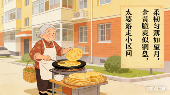 柔韧匀薄如望月,金黄脆爽似铜盘,太婆游走小区间。
