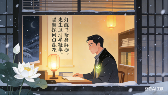 灯醒书斋身解枷,先生血泪早凝华。隔窗探问白莲花。