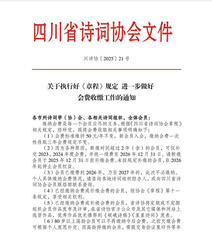 (3)会员已缴费到2026年,乃至2027年的,此次不必缴纳。个人具体缴纳会费情况,请咨询本地诗词组织经办人,或向四川省诗词协会会员联络部联系查询。