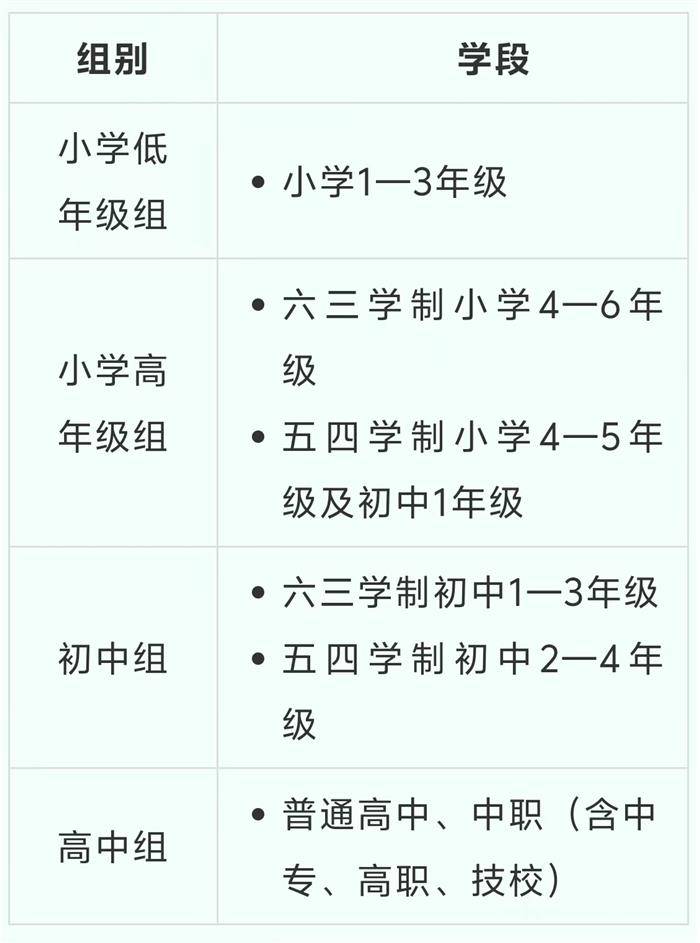 (1)参赛形式:团体参赛,每支团队人数为3-20人(不含教师),团队成员需为同一参赛组别的在校学生(见参赛组别设置),不得出现不同组别学生混合演绎参赛;如小学低年级组别仅限1、2、3年级学生参与,不得出现高年级学生,初中组团队作品中不得出现高中学生。
