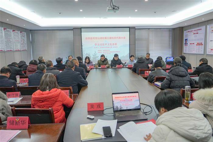 2025年12月26日,岳西县司空山诗社第三届社员代表大会在飞旗寨风景区召开。岳西县委宣传部副部长徐进群,县民政局党组成员吴巍巍,县文联副主席沈足芳,店前镇店前镇党委委员、宣传委员王冰倩,明堂诗社、惜字亭诗社、县诗词学会等友社嘉宾,本社社员代表,共40余人参加会议。