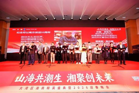 年度压轴大戏发生在2025年12月28日。在深圳龙华国际会议中心举办的“山海共潮生-湘聚创未来——大湾区湘商精英盛典暨2026迎春晚会”上,诗会作为核心文化支持单位,进行了一次堪称典范的“文化赋能”。诗会并未仅仅提供助兴节目,而是系统性策划了“专题诗词创作—会长群体朗诵—书法名家题贺”的文化组合拳。诗会特邀厉有为、杭中华、郭杰、彭发生以及美国金山诗艺会等一百多位海内外诗人和社团创作礼赞湘商精神的诗词,并匠心独具地安排陈仕国(吉首大学)、朱玉佩(中南大学)、胡伟鹏(湖南科技大学)、刘荣欣(湖南农业大学)、任洪波(湖南第一师范)、曾小虎(湖南工程学院)等十六位高校校友会会长代表,亲自登台朗诵。