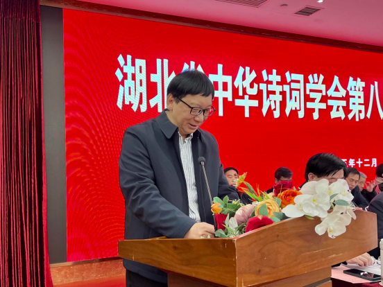 周达副会长在讲话中高度肯定了湖北省中华诗词学会过去五年来砥砺前行所取得的成就,赞扬了湖北省中华诗词学会在上级部门的正确领导和指导下,在全体会员的共同努力下,始终以“促进中华诗词优秀传统文化创造性转化和创新性发展,让中华诗词走向全国、走向海外、走向世界”为核心目标的工作理念,认真组织,扎实工作所取得的显著成果。他希望,学会新一届领导班子要在党组织的正确领导下,团结一致,传承创新,自觉把诗词文化建设融入国家文化战略,繁荣发展中华诗词文化,大力推动中华诗词的普及与应用,全面落实中华诗词学会即将发布的《“十五五”时期诗词发展规划》,按照周文彰会长提出的强化诗词组织“五种生命”和“七项任务”思路要求,深耕传统,让诗词与时代同频共振;务实创新,让诗教与百姓生活相融;拓展传播,让诗意与数字世界携手;广育人才,让优秀传统文化代代相传。