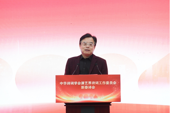 中华诗词学会常务副会长林峰在致辞中说,演艺界诗词工作委员会自成立以来,始终秉持“以诗化人、以艺通心”的宗旨,成为连接古典诗词瑰丽世界与当代演艺广阔天地的重要桥梁与活跃平台。过去一年,委员会同仁以炽热的“诗心”滋养“艺德”,以精湛的“艺魂”熔铸“诗情”,我们看在眼里:在舞台之上,有新编戏曲巧妙化用诗词作品,使古老意象在诗性结构中流淌,令千年雅韵在现代旋律中深情回荡,真正实现了“创造性转化与创新性发展”,为繁荣社会主义文艺百花园贡献了独具芬芳的“诗艺之花”。对此,中华诗词学会深表赞赏!