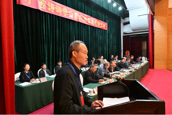 广西诗词学会副会长兼秘书长向金宝代表广西诗词学会向大会作第七届理事会工作报告。他从坚持党管诗词文化原则成为各级诗词组织的自觉行动;全区诗词组织和诗词队伍建设进一步加强;实施诗词精品创作工程成效逐步显现;开展诗词“入史”工作取得新的突破性进展;诗词创作和学术交流活动得到常态化开展等方面,总结了第七届理事会的工作成绩。从坚持党的领导,才能确保诗词工作正确的前进方向;坚持服务发展大局,才能创作出无愧于时代的伟大作品;坚持为人民而创作,才能体现诗词工作的永恒价值;坚持守正创新,才能提供诗词事业发展的动力;坚持团结就是力量,才能保障诗词队伍充满活力等方面系统总结了工作经验,查找了工作中存在的不足,剖析了原因。代表第七届理事会对未来五年的发展目标和思路规划了愿景,提出了希望。