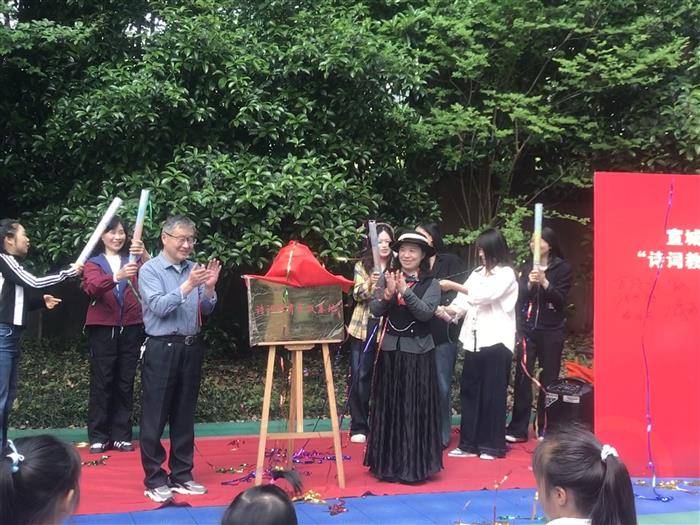 上午十时,全场倒计时,宣州诗词学会名誉会长方诗韵、幼儿园园长许培共同揭开牌匾红绸,环保电子礼炮齐鸣,“诗词教育实践基地”几个大字赫然显现。现场响起热烈的掌声,背景音乐也将活动推向高潮。