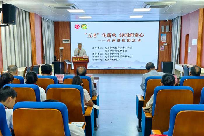 活动伊始,王如晓老校长以“诗歌欣赏与创作”为主题展开精彩讲座。同学们通过“动、画、唱”相结合的趣味体验,探索古诗学习的新路径,深切感受中华传统文化的独特韵味。从借景抒情的《赠汪伦》,到生动活泼的《咏鹅》;从诗中有画的《静夜思》,到动静相宜的《春晓》,王老校长择取经典诗篇,以通俗易懂的语言解读诗词意境,引领学生在轻松愉悦的氛围中步入古诗的世界。此外,他还分享了《茂名山歌》《年例吟》等融入本土文化的原创诗作,引导学生体悟诗词不仅蕴于书本之中,更流淌在日常生活的情味里。