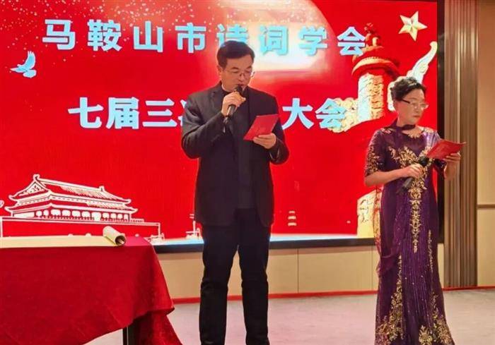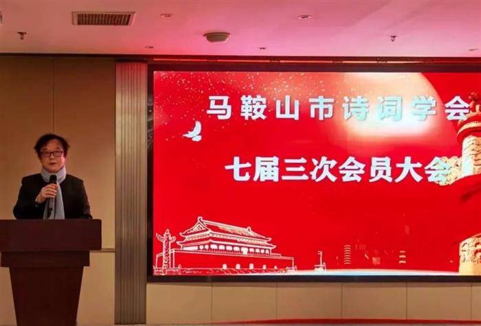 1月11日上午,马鞍山市诗词学会在雨山湖饭店四楼大厅召开第七届三次会员大会,全市诗词学会会员齐聚一堂,共襄文坛盛事,同谱发展新篇。市社会科学界联合会主席聂庆武、副主席华胜峰,原市委宣传部副部长王平,市教育局领导谢阳,安徽工业大学附中领导,市书画协会主席王文,市易经学会会长何晓军,诗企共建单位领导潘立和等应邀莅临大会并表示祝贺。
