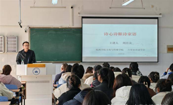 活动伊始,在皖西学院综合楼教室,百余位师生齐聚一堂。周月友老师率先以《诗心诗眼诗家语》为题开讲,他从近期闭幕的大别山区域联盟新田园诗词大赛获奖作品赏析切入,为同学们呈现了一堂生动的诗词评论课。随后,六安市诗词学会副会长张庭清以《浅析七言绝句的基本格律和创作方法》为核心内容,结合自身七绝创作经验,围绕古典诗词的格律魅力、意境营造、时代精神融合及当代诗词创作实践等主题,与在场师生分享了宝贵的心得与独到见解。两位老师通过优秀作品赏析、创作技巧讲解及现身说法等多种形式,生动展现了中华诗词的深厚底蕴与时代活力,让师生们沉浸在诗词的魅力之中。