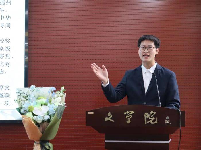 扬州大学文学院本科生杨济远代表高校工委青年学子发言,结合自身诗歌与对联创作实践,分享了对经典的研习心得与时代感悟,展现了当代青年深耕经典、紧扣时代、践行文脉传承的青春担当。