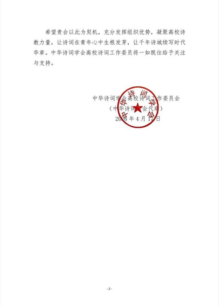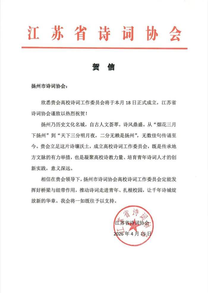 扬州素有“诗歌之城”美誉,千年诗脉绵延不绝。此次扬州市诗词协会率先在全国地方诗协中创立高校工作委员会,具有重大而深远的意义:它标志着地方诗词组织与高校之间从零散合作走向机制化、系统化的深度协同,为中华优秀传统文化的创造性转化与创新性发展提供了鲜活的“扬州样本”;它以高校为主阵地、以青年为核心力量,从根本上解决了诗词传承中“后继有人”的关键问题,为千年诗城培厚了青春土壤、激活了内生动力;它更将古典诗词教育深度融入高校立德树人全过程,使青年学子在平仄格律之间涵养家国情怀,在诗韵墨香之中坚定文化自信。可以预见,这一创举必将催生一批富有时代气息的诗词新作,造就一支德艺双馨的青年诗词队伍,让扬州“诗歌之城”的金字招牌在青春接力中愈发璀璨,为中华诗词在新时代的繁荣发展贡献持久的扬州力量。