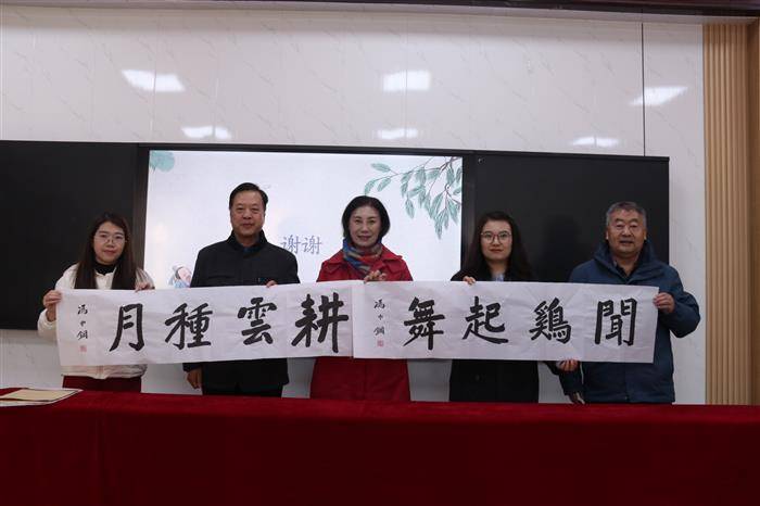 尤为珍贵的是,学会还特意赠送了书法家冯忠刚、杨小林的书法作品。当几幅笔走龙蛇、端庄稳重、气韵生动的墨宝展开时,现场响起了阵阵惊叹。这些作品不仅是书法艺术,更是中华传统文化中“诗书合一”精神的完美体现,它将古典诗词的意境与书法艺术的线条之美融为一体,为校园增添了一抹高雅的文化亮色。学校领导曹丹及语文教师们激动地接过这份沉甸甸的情谊,表示这些书籍与书法作品将丰富学校的图书馆藏和校园文化环境,成为激励学生亲近文学、热爱传统诗词的重要载体。