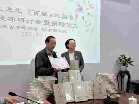 9月26日,由湖南省诗词协会主办的马昌发《百疾·沁园春》新书发布研讨会暨捐赠活动在在湖南省图书馆报告厅隆重举行。湖南省诗词协会会长蔡建和,湖南图书馆党委委员、纪委书记陈姣凤,湖南省诗词协会顾问罗建平以及有关人士、诗友30多余人出席。新书发布研讨会暨捐赠活动由湖南省诗词协会副会长兼秘书长童中贤主持。