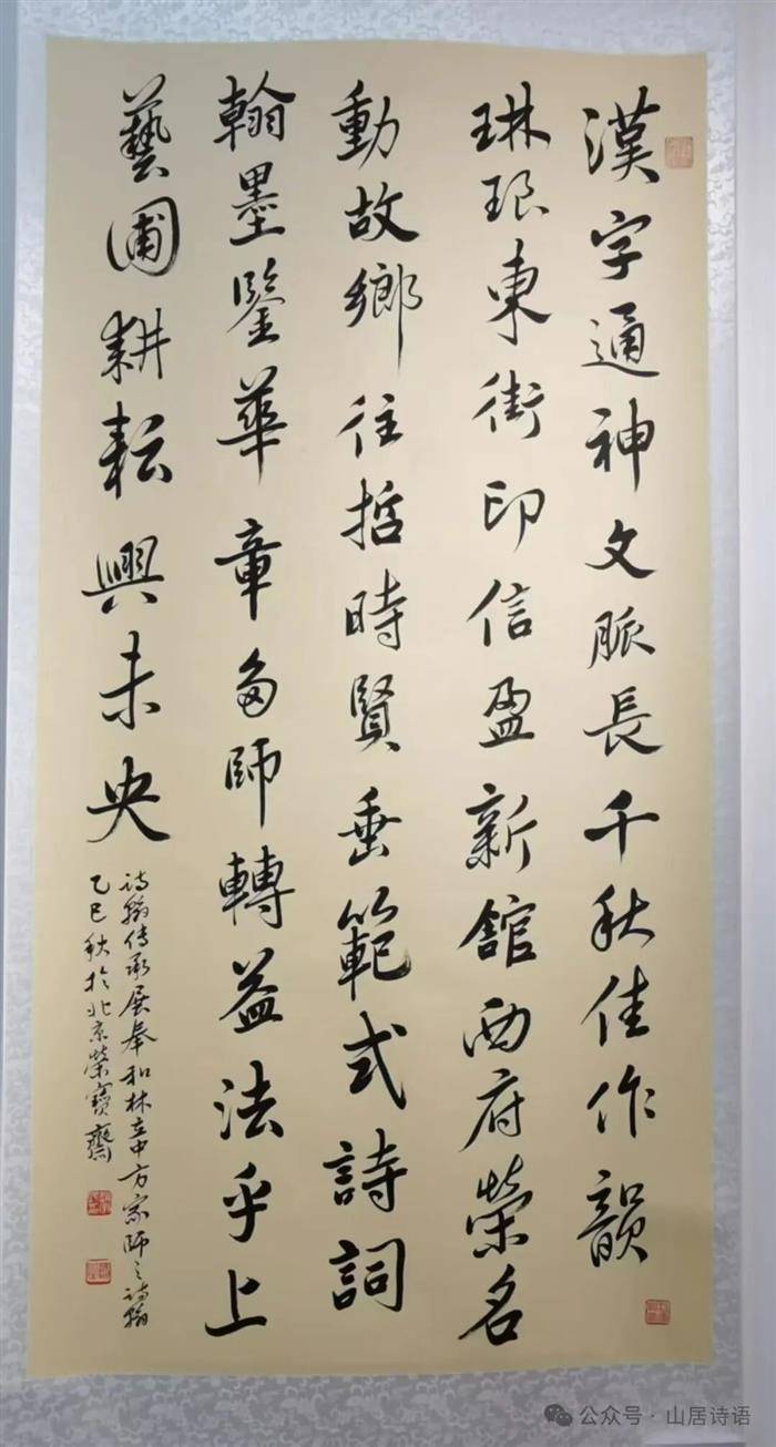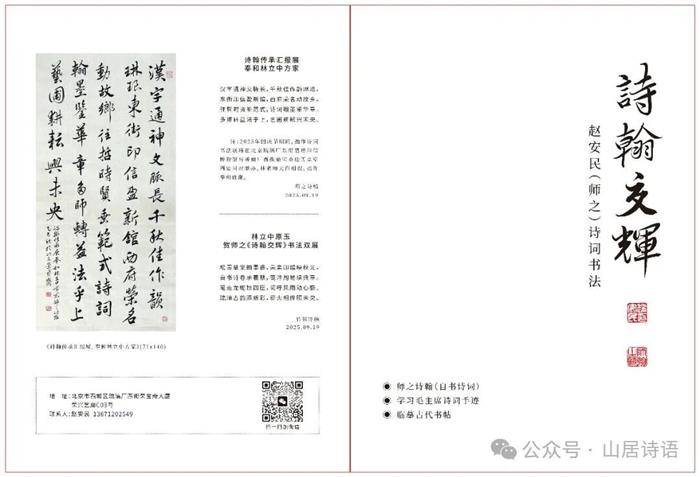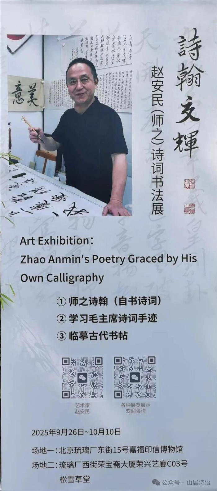 “诗翰交辉一赵安民(师之)诗词书法展”,于2025年9月26日在北京琉璃厂文化街两个场地同步开展,主场地是琉璃厂东街15号北京嘉福印信博物馆,另一场地在他的工作室琉璃厂西街荣宝斋大厦荣兴乙廊C03号松雪草堂。这次展览系统呈现师之在诗词与书法领域的多年探索成果,反映“师之诗翰”传承学习、交相辉映之大概情况,包括三大板块:师之诗翰(自书诗词),学习毛主席诗词手迹,临摹古帖。东街主场地展出作品40多幅,内容是他自己的诗词30多首,及毛主席诗词7首;还展出他临王羲之《兰亭序》帖与临赵孟頫《王羲之逸事》帖两幅手卷作品。