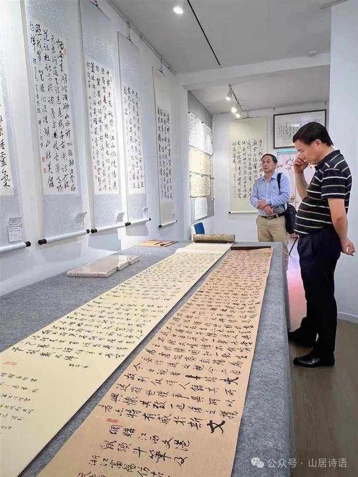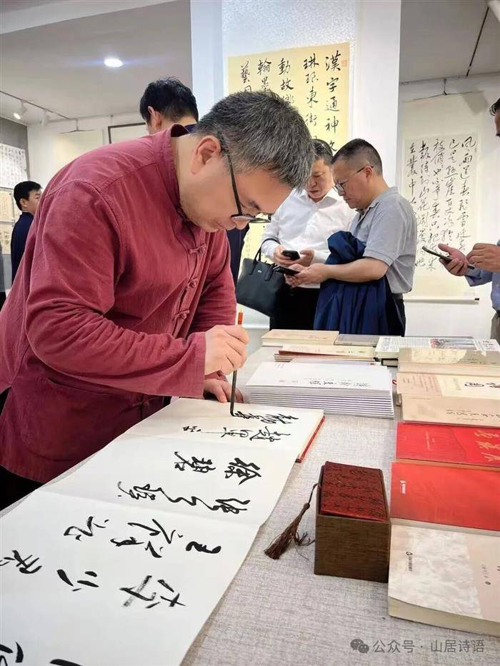 展览吸引了文化界、出版界众多学者与艺术爱好者前来观展。著名诗人、《诗刊》社主编李少君先生接受了中央数字电视书画频道记者采访,对赵安民诗词书法交相辉映特色予以高度评价。中央数字电视书画频道记者张芷赫先生在报道中,以专业记者眼光分析了赵安民诗词书法展三大板块各自特点,高度评价其诗翰交辉的艺术成绩,认为“临摹古帖”部分展现了赵安民对传统笔法的深入研习,其临作不仅形神兼备,更融入了训诂学者对文字源流的理解,笔意古朴而富有书卷气。而在“学习毛主席诗词手迹”板块,可见他在笔墨中融汇了毛体书法的豪放气势与行草韵律,结体开阔、线条奔放。“自书诗词”板块集中展示了赵安民原创诗作与书法艺术的深度融合,其诗词格律严谨、意蕴典雅,内容多源于其对文化传承与人生阅历的感悟。