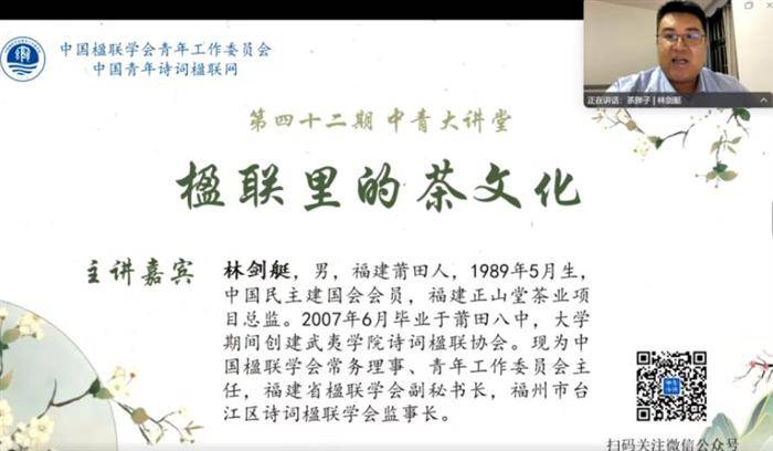“竹语松风琴韵,茶烟梧月书声”。11月15日晚,第42期中青大讲堂在线上如期举行。中国楹联学会青年工作委员会主任、福建省楹联学会副秘书长林剑艇受邀作题为“楹联里的茶文化”的报告分享。本期讲堂由活动中心郭峥主持。 林剑艇从自己与楹联和茶的故事切入,深入讲解了茶文化的内涵与价值。他强调茶不只是解渴的饮品,更是文化的载体、心灵的栖息地。他细数多个经典茶联,结合联句内涵解读茶与文化、人生的联结,如杭州西湖茶社联 “十年许勾留,与西湖有缘,乃尝此水;千秋同俯仰,惟青山不老,如见故人”,以清雅文字道尽茶与人的绵长缘分;江西刘新才所撰 “天下闻香,四海争传桐木秀;杯中论道,一杯不觉武夷遥”,勾勒出桐木红茶的独特魅力;河北董海红的 “本色依然,曾历一番水火;清香如故,不惊几度沉浮”,则以茶的淬炼暗喻人生的坚韧品格。此外,他还提及友人韦代森联句 “知己如茶如水,浓淡相宜”,坦言 “以联结友、以茶诉情”的情谊更是珍贵。 在红茶的传承故事里,林剑艇重点讲述正山小种的兴衰与重生。作为世界红茶鼻祖,它曾一度没落,幸得吴觉农“中国不能没有世界顶级红茶”的坚守、张天福“正山小种可再成顶级红茶”的期许,及江润梅、江元勋等传承人“祖宗的东西不能丢”的执着,才让这门非遗技艺重焕茶香生机。山东淄博王世侠“孤诣苦心,精挑绿叶三千树;创新承古,未负红茶四百秋”的对联,正是这份坚守与传承的生动写照。他还详解金骏眉形美色润、汤色金黄等五大特质,并以江苏王凤霞的五绝“武夷金骏眉,一饮起相思。谁撷尖尖叶,煎成碗碗诗”收尾,借诗句勾勒其韵味,引人无限遐思。 互动环节,面对“茶与联的精神共同点”这一提问,林剑艇答道:“茶与楹联同属中华优秀传统文化,二者相辅相成、彼此赋能。楹联作为文学载体,承载着人们的无限情感;茶叶亦是如此。茶道所倡导的‘清雅和’‘俭清和静’等核心理念,与楹联的情感寄托功能相契合,都能让人在浮躁尘世中寻得内心的宁静。” 这场茶联之谈,不仅是文化的传递,更似心灵的邀约——愿更多人能在茶香联韵中觅得岁月清欢。(通讯员 周双辉)