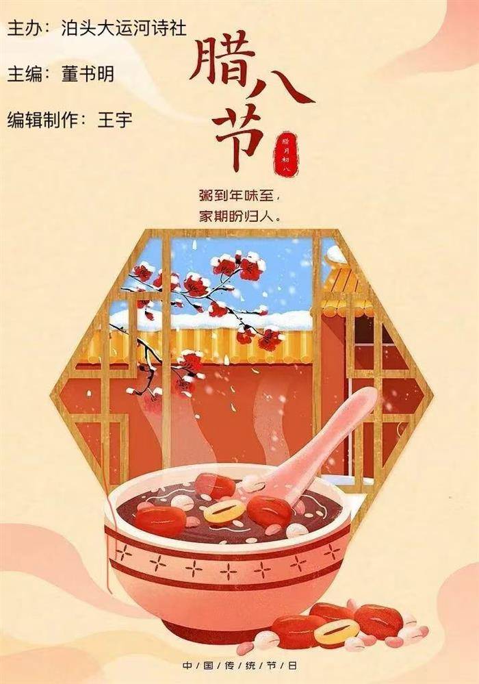 泊头大运河诗韵【腊八同题诗词专辑】 2026年1月刊总第217期 董书明 五律·腊八吟(新韵) 少小觉冬冷,棉衣裹瘦身。 腊八粥暖腹,白素雪堆人。 绿柳垂垂老,红梅艳艳芬。 运河冰始见,春意遗春神。 注释:遗(Wei,去声),赠予,送给。春神,司春之神,名青帝,居于东方,主管春季。 2026·1·26 罗崇亮 腊八感怀(中华通韵) 腊八相伴大寒节,天上人间忙不歇。 万户张罗筛谷豆,五云蘸墨写梅帖。 香粥粘粕压盘筑,碎羽银毡铺满街。 诸事周全迎午日,开心快乐笑声叠。 张丙英 七律·腊八粥味话农桑(新韵) 腊八粥味话农桑,一釜珍稠念垦荒。 春陌扶犁沾晓露,秋原刈穗沐斜阳。 千畴播雨凝辛苦,百垄收风蕴岁忙。 慢煮杂粮知不易,碗中皆是汗流香。 2025.1.24 七绝·腊八粥浓念袁隆平(上平一东) 腊粥浮香古意融,今朝饱暖赖袁公。 毕生俯首耕禾亩,铁碗牢端食足丰。 2026.1.26 腊八日思母 (一) 节临腊序忆萱亲, 犹记娘身煮饯珍。 尽管今朝循母法, 却无旧味碗中存。 砂煨糯粒香萦舍, 火暖寒铛念愈沉。 姊妹同牵方寸意, 清粥一并寄天恩。 (二) 忆昔饥寒岁, 煮粥愁断粮。 今朝衣食足, 台灶却无娘。 2026.1.26 高汝清 七绝·腊八节 霁雪枝梅映岁朝,八珍嘉粥为亲调。 香浮绮席人同暖,春入家山福暗饶。 孟昭臻 腊八有吟(新韵) 正是隆冬四九天,腊八偏遇五更寒。 家家晨晓煮温暖,碗碗香粥祈乐年。 董淑玲 腊八粥(新韵) 晨起抱柴文火燃,伸腰豇豆黍粥黏。 街心八宝娃哈购,联想儿时那碗甜。 徐连生 腊八节 隆冬寒暮天,腊味生紫烟。 多色人生路,粥香岁月间。 迎新祈福寿,辞旧庆丰年。 躍马康庄道,奋蹄逐梦圆。 昝秀昌 腊八粥 冬日熬锅腊八粥,香甜入口暖身腹。 童孩问及食材料,五谷杂粮尽全录。 温衍庆 腊八粥(新韵) 细品碗中香与甜,可知粒粒蕴辛酸? 暑寒四季躬耕者,未到古稀腰已弯。 肖静茹 七绝·腊八二首 一 腊八晨粥 银釜深藏五谷香,晨光初照满庭芳。 不须猛火催汤沸,一碗温情暖胃肠。 二 腊八忆旧 瓦釜微鸣粥渐稠,儿时滋味梦中留。 围炉犹记外婆嘱,暖透寒窗笑语柔。 张铁柱 腊八节感怀(通韵) 数九寒风月冷玄,五更淘米把汤添。 忆怀柴灶火苗旺,米谷飘香院户间。 古有集场筹善事,饥民一碗散严寒。 如今人在家中暖,感念国昌盛世年。 李文平 腊八咏怀 时进腊八年味稠,已觉春风拂面柔。 晨火缭绕驱岁冷,慢煮时光霜染头。 粥香满屋暖肠胃,传承俗韵福寿求。 悠悠岁月承今古,盛世安康咏未休。 赵志轩 乙巳腊八感怀 时逢腊八又新年,粥暖千家爆竹连。 五谷丰登凝碗底,八珍甘润涌心田。 霜风凛冽梅初绽,岁月峥嵘梦自圆。 遥忆儿时慈母泪,乡愁缕缕灶神前。 董培海 腊八思怀 腊日炊烟绕祭香, 亲邻馈粥共丰穰。 门庭洒扫祈康健, 瓮牖澄明寓寿长。 菽杏熬霜凝洁雪, 枣饧沸玉透羹凉。 但存仁善传家久, 德润乡闾福自彰。 七律·腊八吟 文/阿原(新声韵) 社鼓驱傩迎紫气,佛光普照艳梅腮。 七珍釜煮香盈户,五味粥融暖入怀。 白玉垂檐镌岁序,窗花飞鹊造瑶台。 年临九域客将至,莫负诗心带酒来。 现代诗 腊八节 文/李民强 日历翻开新的一页 腊八节站在了五九的前沿 透过晨曦的薄雾 望见了屋顶的袅袅炊烟 腊八粥腊八饭 一股浓香忘记了天寒 带着妈妈的味道 看岁月染白了发梢 又是一个转折点 踏雪而来的就是年 年味从今天开始 万家灯火照亮了阖家团圆 腊八节,雪落成诗 (散文诗) 张志祥 那年腊八节 雪下了一夜 天亮了 窗外依然雪花飘飘 雪花变幻着身姿在空中飞舞 我喜出望外 仰天长叹 老天不负人愿 终于等来了这场大雪 皑皑白雪 雪雾朦胧 把我们带入了童话般的冰雪世界 片片雪花寄深情 腊八节 这天人们喝着热呼呼的腊八粥 喝在嘴里 香甜在心里 这场雪给腊八节增添了浪漫 围炉取暖 共话腊八 这是一场多情的雪 雪落成诗 你看 雪后的农庄多么美丽 洁白的雪花 是天使 是精灵 把大地装点得银装素裹 如诗如画 诗情画意尽染我的故乡