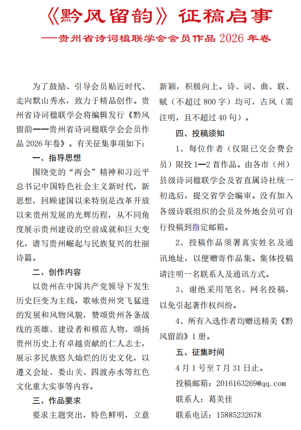 《黔风留韵》征稿启事 ——贵州省诗词楹联学会会员作品 2026 年卷 为了鼓励、引导会员贴近时代、 走向默山秀水,致力于精品创作。贵州省诗词楹联学会将编辑发行《黔风留韵——贵州省诗词楹联学会会员作品 2026 年卷》。有关征集事项如下: 一、指导思想 围绕党的“两会”精神和习近平总书记中国特色社会主义新时代,新思想,回顾建国以来特别是改革开放 以来贵州发展的光辉历程,从不同角度展示贵州建设的空前成就和巨大变化,谱写贵州崛起与民族复兴的壮丽 诗篇。 二、创作内容 以贵州在中国共产党领导下发生历史巨变为主线,歌咏贵州突飞猛进的发展和风物风貌,赞颂贵州各条战 线的英雄、建设者和模范人物,颂扬贵州历史上有卓越贡献的仁人志士,展示多民族悠久灿烂的历史文化,以遵义会址、娄山关、四渡赤水等红色 文化重大实事等内容。 三、作品要求 要求主题突出,特色鲜明,立意新颖,积极向上。诗、词、曲、联、赋(不超过 800 字)均可,古风(需注明,且不超过 40 句)。 四、投稿须知 1、每位作者(仅限已交会费会员)限投 1—2 首作品。由各市(州)县级诗词楹联学会及省直属诗社统一初选后,提交省学会编审。没有加入各级诗联组织的会员及外地会员可自行投稿到指定邮箱。 2、投稿作品须署真实姓名及通讯地址,以便赠寄作品集。集体投稿请注明一名联系人及通讯方式。 3、谢绝采用笔名、网名投稿,以免引起著作权纠纷。 4、所有入选作者均赠送精美《黔风留韵》1 册。 五、征集时间 4 月 1 号至 7 月 31 日止。 投稿邮箱:2016163269@qq.com 联系人:葛美佳 联系电话:15885232678