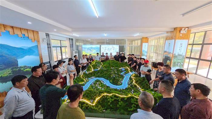 未晞园新安江精品度假酒店项目位于歙县武阳乡正口村红庙,考察团在工作人员讲解下,先是参观项目沙盘以了解整体规划,后乘游轮沿新安江实地探访项目核心亮点。碧波荡漾中沉浸式趋近这座“漂浮于江畔的生态方舟”,感受两岸青山与建筑轮廓相映成趣的独特入境仪式感。