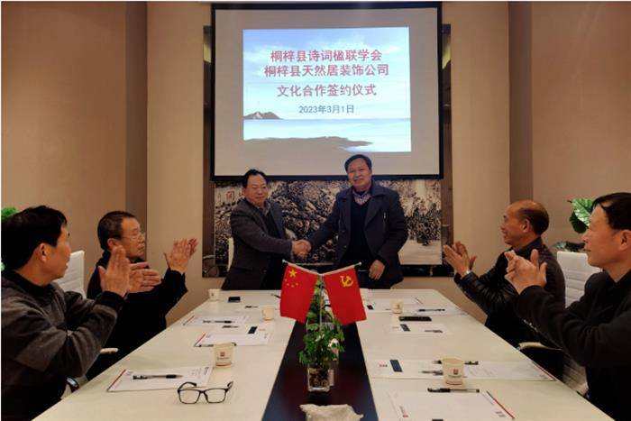 2023年3月1日下午,桐梓县诗词楹联学会和桐梓县天然居装饰有限公司文化合作座谈会在贵遵律师事务所办公室召开。桐梓县诗词楹联学会会长陈华峰、副会长赵叶青、秘书长文世泉、办公室主任黄家友、财务部主任令狐山、天然居装饰有限公司总经理王强参加会议。会上,陈华峰会长代表县诗词楹联学会,王强总经理代表天然居装饰有限公司在合作协议上签字。