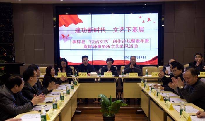 2023年3月1日,桐梓首届 “法治文艺”创作论坛在贵遵律师事务所举行,来自社会各界的50多名文艺工作者齐聚一堂,共同研讨法治与文艺作品的融合与创新,推进法治文艺繁荣发展。论坛由桐梓县文联主席查小刚主持,桐梓县政协副主席冯于桥出席会议并作了讲话。桐梓一中校长江君龙、桐梓县司法局副局长赵行河、娄山中学副校长令狐欣等出席。桐梓县文学协会、桐梓县诗词楹联学会、桐梓县书法协会、桐梓县音乐协会、桐梓县美术协会、桐梓县摄影协会、桐梓县戏曲协会、桐梓县灯谜协会、桐梓县民间文艺协会、桐梓县舞蹈协会等10个文学文艺协会,以及桐梓县诗词楹联学会友好合作单位桐梓县司法局、桐梓一中、桐梓二中、娄山中学、红岩中学、天然居装饰、林内地暖、贵州贵遵律师事务所等8家单位派员参加了当天的活动。