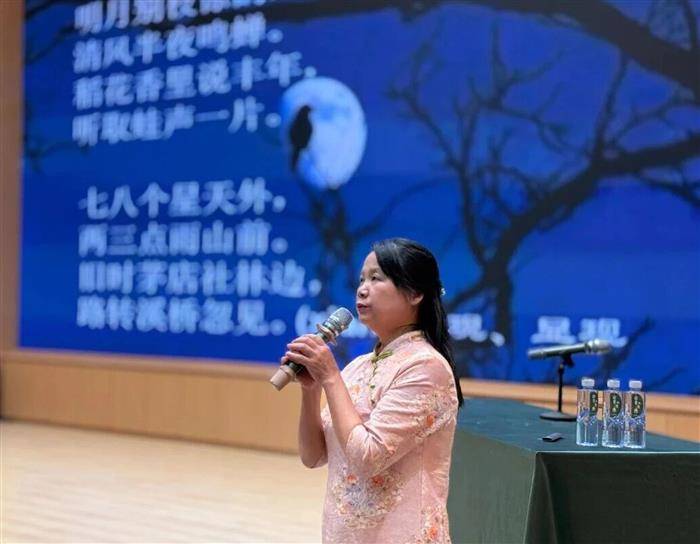 范雪芳老师则以《走近诗词的音韵》为主题,带领听众感受诗词音韵之美。她通过方言吟诵,生动展示“平长仄短”的韵律特点,并以粤语、客家话等方言现场演绎古诗词,引发听众强烈共鸣。她指出,方言是语言的活化石,用其音调演绎诗词,能激活诗词的生命力,使其真正回归生活、连接古今。
